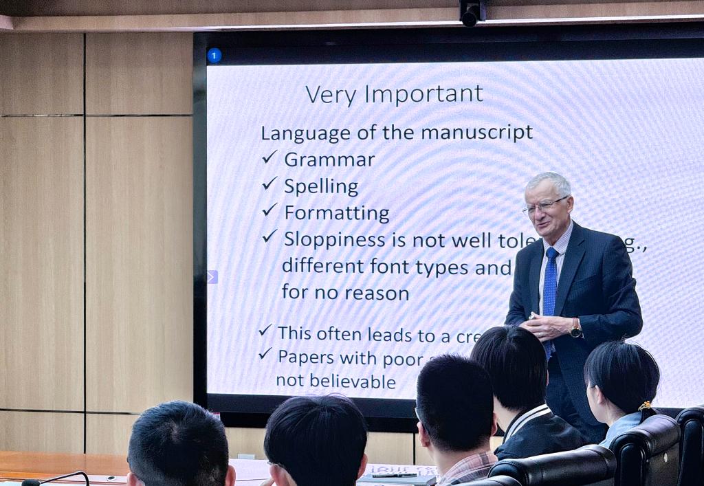 第一场报告题目为“科技论文写作”,Kusiak教授阐述了学术论文中创新性的重要性,以及在学术影响力和商业价值方面评估论文成功的标准。同时,他特别强调了论文语言的规范性,包括语法、拼写和格式,认为这是判断论文可信度的重要标准之一。