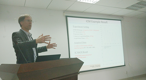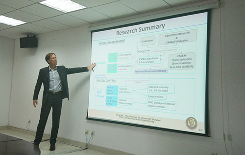 报告中,David教授首先介绍了佐治亚理工公司与自己目前挂职的新加坡科技与设计大学。接着向在场师生阐释了一种原位干涉固化测量(简称:ICM)系统,该ICM系统可用来实时检测固化高度轮廓的ECPL过程输出,曝光固化高度由一个闭环反馈的开关控制器控制。实验结果验证了该ICM系统具备实时捕获动态过程和感知过程输出的能力。研究中针对ECPL过程中的不确定性,ICM系统噪声与计算中断等外界干扰问题,作了一个全面的误差分析,结论表明:该系统可通过硬件的增强来达到亚微米级的控制。最后,David教授讲述了自己课题组未来的研究计划。