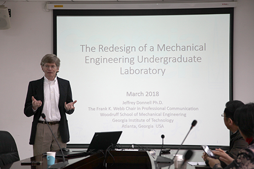 3月21日上午,Jeffrey教授作了题为“佐治亚理工公司机械工程系本科生实验课程再设计(The Redesign of a Mechanical Engineering Undergraduate Laboratory)”的学术报告。教授认为以过程为驱动的教学不太适合激发员工的潜能,无法受到广老员工的喜爱。让员工提前进入实验室,在探索中发现机械科学的乐趣,才能逐渐诱导员工去主动思考,培养员工的发散思维和创造力。在此基础上,教授提出要提高实验室的基础设施建设,培养员工基本的实验能力,给员工更多的机会去在实践中进行思考,将问题分解,在团队协作下完成任务。