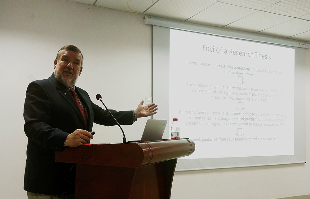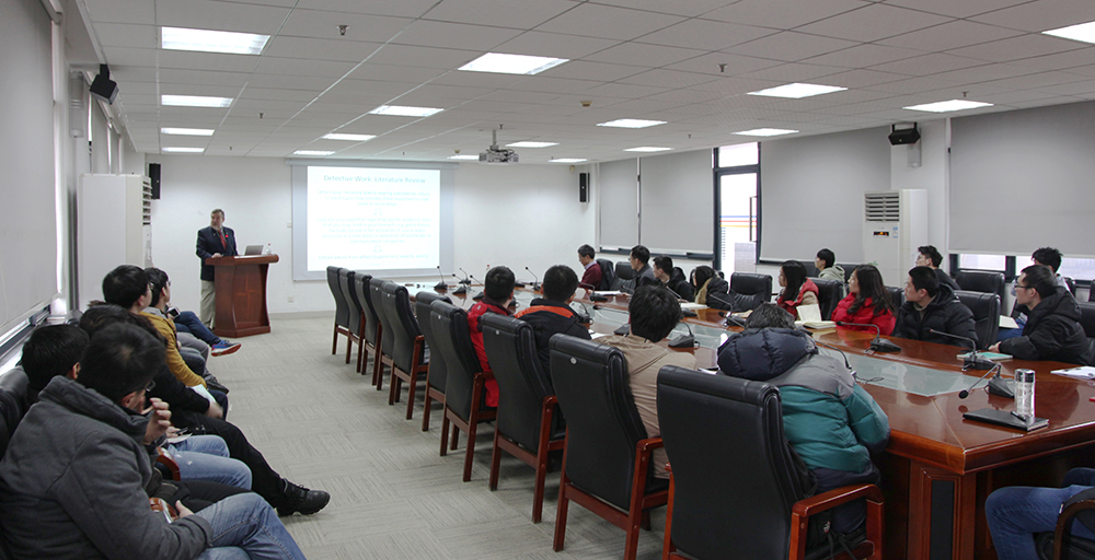 在报告中,Hipel教授首先通过几个简单的问题与现场的师生互动交流,增加了大家的兴趣和热情。他表示,学术研究的首要一步就是在自己感兴趣的领域找到一个有趣的问题,并在进行文献阅读之前自己思考如何解决这个问题。随后他阐述了文献的概述方法和论文写作的技巧,同时还指出参加学术报告和国际学术交流会能碰撞出新的思想,受益良多。最后,他表示,定期与自己的导师和专家进行交流也是提高自身学术造诣的重要方式。