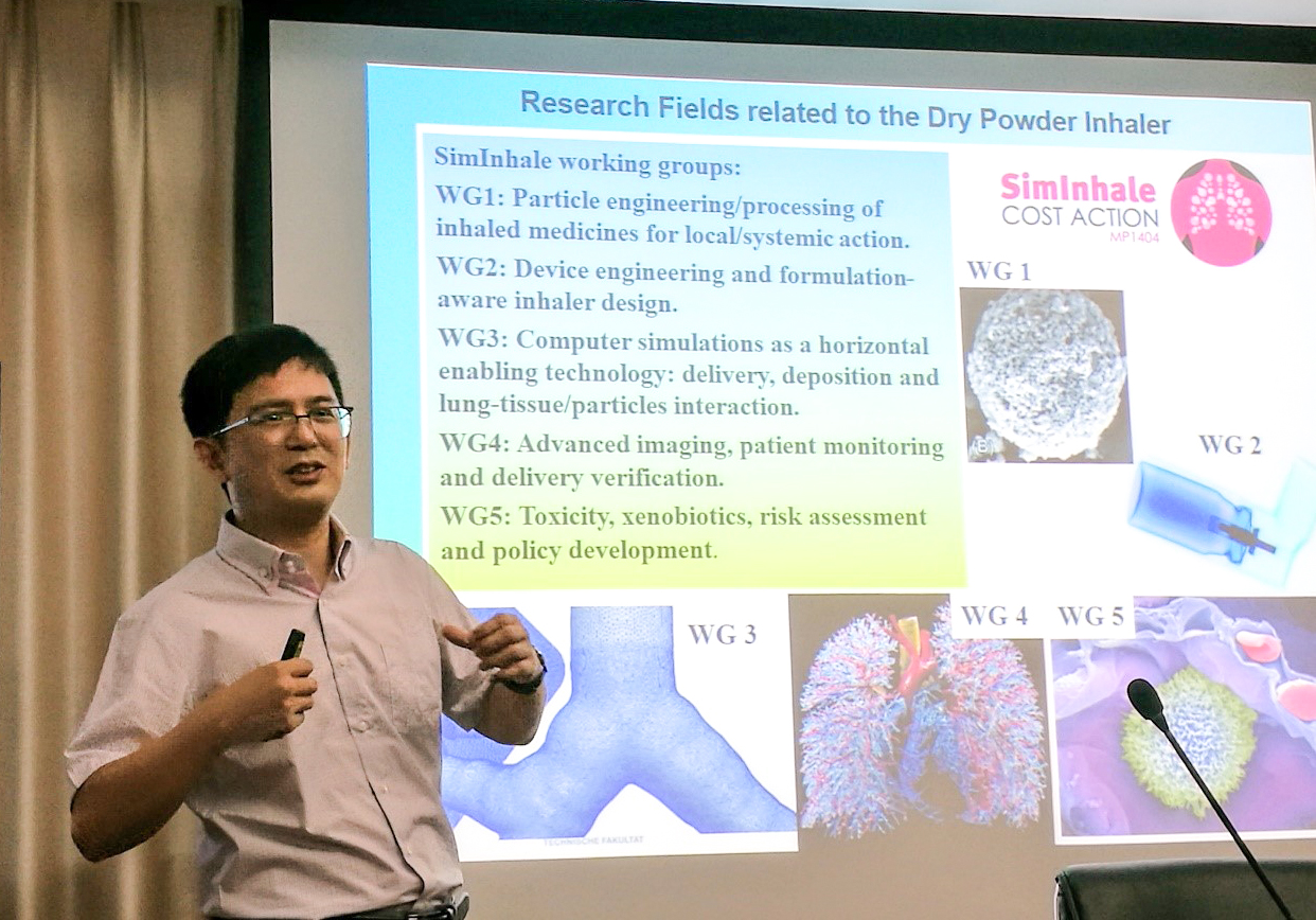 在报告中,崔博士首先介绍了干粉吸入器的市场价值以及人们使用干粉吸入器所存在的普遍问题,然后指出了在干粉吸入器的研发过程中的学术问题。随后,崔博士讲解了采用多尺度数值建模方法对吸入器中的药物颗粒与载体颗粒分离过程进行研究,并对各种参数的影响进行对比。最后,崔博士也讲解了使用多相流模拟对肺部中的颗粒沉积进行研究。报告之后,崔岩博士与在场的师生交流了研究前景,并期待双方建立持续联系,开展合作研究。