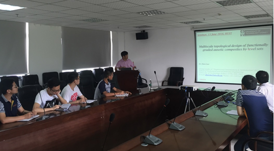 2016年6月13日,应高亮教授邀请,悉尼科技大学罗震博士来公司交流,并作了题为“Multiscaletopological optimization design of functionally graded auxeticcompositesby levelsets”的学术报告。