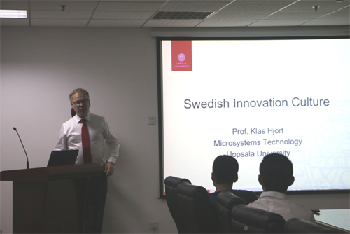 Yiğit Mengüc副教授围绕“skills to learn”这一主题对美式科研方法、写作方法和组织协调技巧三个方面进行了详细的阐述,对研究人员自身的组织协调工作任务以“To Do”、“doing”和“Done”作为阶段性的划分。Klas Hjort教授以“Swedish Innovation Culture”为题,对“Innovation”的定义作出了科学的阐述,并由此谈及他所在的工作单位的管理方法和科研效果,最后,他从瑞典近现代的振兴与瑞典人的创新文化方面对其演讲进行了总结。