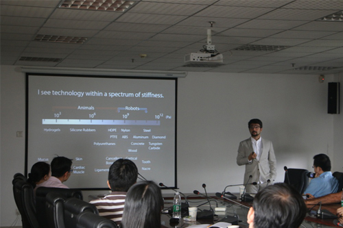 Yiğit Mengüç副教授首先介绍了能提供给工程师很多灵感的生物,通过观察壁虎的脚趾,用橡胶及液态金属制成的传感器,可以用它来跟踪人体的运动轨迹,以此表示柔性电子器件的发展将越来越方便我们的日常生活。