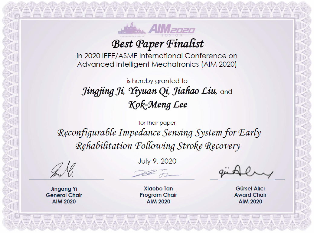 大会从投稿的450余篇文章中,经评选分别推举出5篇最佳论文提名奖和5篇最佳员工论文提名奖。其中,冀晶晶副教授团队的论文“Reconfigurable Impedance Sensing System for Early Rehabilitation following Stroke Recovery(脑卒中康复后早期康复的可重构阻抗传感系统)”获得本次会议的“最佳论文提名奖”;李国民教授团队员工(姜娇英,一作)论文“A Novel Pantographic Exoskeleton based Collocated Joint Design with Application for Early Stroke Rehabilitation(一种新的基于泛影外骨骼的同位关节设计及其在早期脑卒中康复中的应用)”获得“最佳员工论文提名奖”。