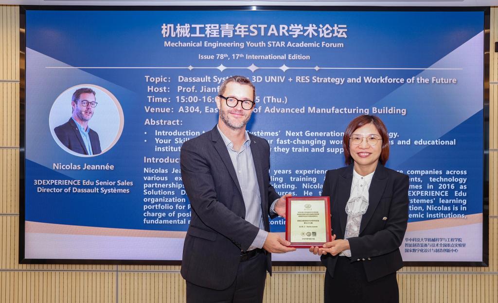 会议结束后,尼古拉・让内博士为永利3044noc师生做专题报告,分享了达索系统的工业软件技术路线图、融合生成式人工智能技术的新一代“3D UNIV+RSES”平台,以及在不同工程领域和大学创新实践教育方面的应用案例。张芬为其颁授报告纪念牌。