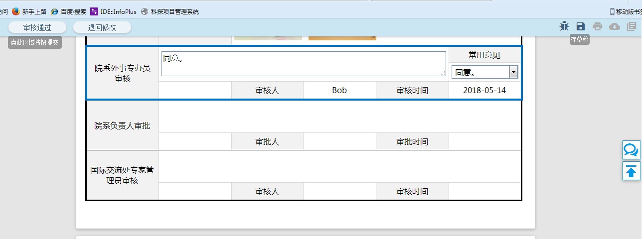 8、申请人填写好后点击“提交”按钮,进入下一步,院系外事专办员审核,对总结表进行审核,审核页面如下图: