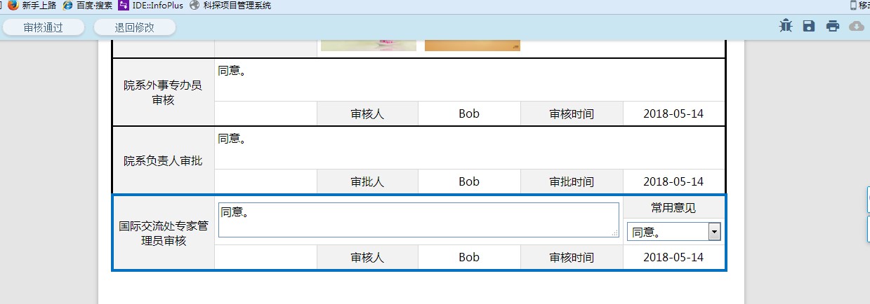 5、院系外事专办员审核通过后进入院系负责人审批环节,如图所示,院系负责人可根据申请情况来操作,点击“同意报国际交流处审批”按钮,则审批通过,进入下一步,国际交流处专家管理员审核。