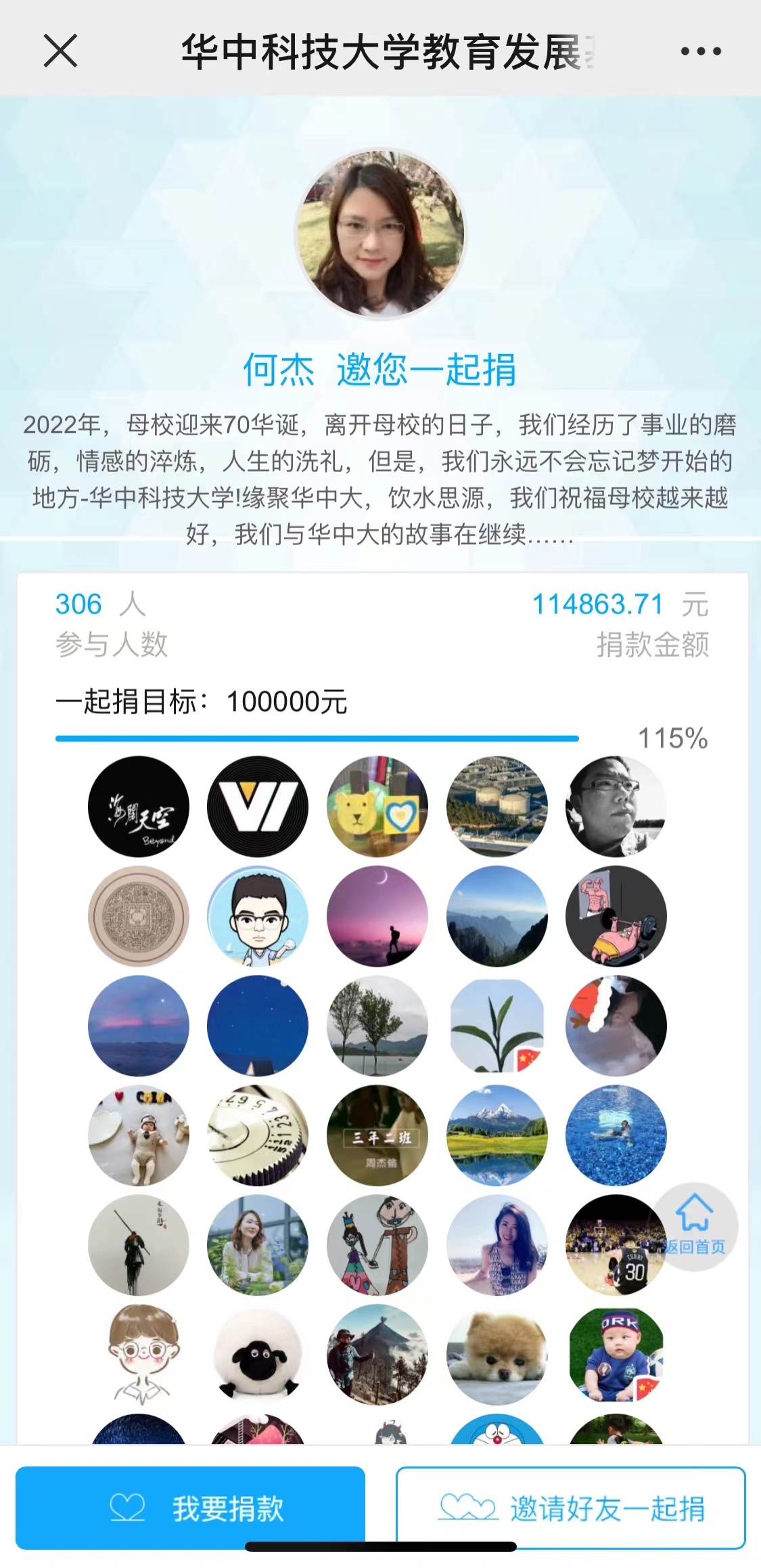 “2022年,母校迎来70华诞,离开母校的日子,我们经历了事业的磨砺,情感的淬炼,人生的洗礼,但是,我们永远不会忘记梦开始的地方——永利3044noc!缘聚华中大,饮水思源,我们祝福母校越来越好,我们与华中大的故事在继续......”近日,公司教育发展基金会设立70周年校庆专项基金,受相关领导委托,永利3044noc原党委副书记何杰在公司员工群里发起“一起捐”倡议,筹款目标10万元,用于设立奖助学金和公司发展基金。员工们情系母校,关心公司的建设发展,积极响应,贡献自己的力量。