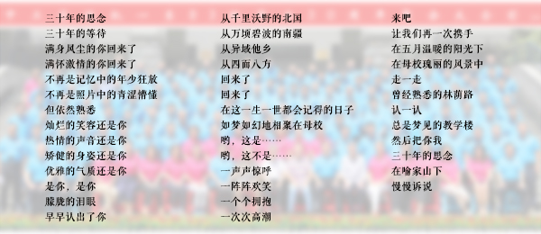 回到既熟悉又陌生的母校,森林下的新道路又宽又整洁,到处林立新的教学大楼,大家感叹母校巨大的变化。回到母校,当年的恩师段正澄院士一见面就能叫出同学的名字,同学心里暖洋洋的,我们怀恋母校,母校也没有忘记我们。