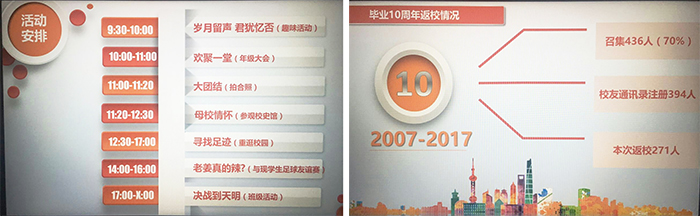 返校活动期间,员工们进行了 “岁月留声,君犹忆否”的趣味活动,开展了题为“欢聚一堂”的年级大会。公司经理丁汉院士,党委副书记丁雨葵,校国际交流处副处长、时任03级分团委书记邱勇,以及03级辅导员何杰老师、孙建新老师作为特邀嘉宾参加了活动。