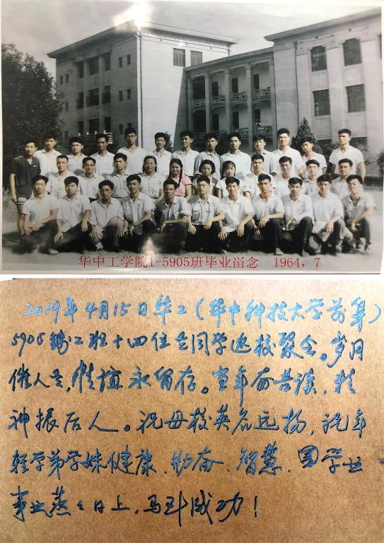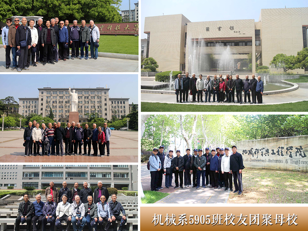 4月15日,原华中工公司机械系5905班的14位员工相约回到母校,庆祝毕业五十五周年。临近耄耋之年的员工们,早已从各自的工作岗位上退休,其中年龄最大的82岁,最小的78岁,但相聚之时却像一群活力十足的新生。他们当中除了武汉本地的部分员工,还有部分来自香港、北京、广州、信阳等地。在过去的55年中,他们中间有许多人都是所在单位的领导或技术骨干,高校的教授,大型企业的厂长、总工程师,享受政府特殊津贴的专家等。