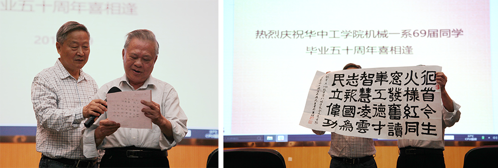 薛发明老师发言并即兴吟诗作《七绝 ——立志为民》,祝华工1969届毕业50周年聚会:“回首今生火样红,同窗发奋读华工;德才智慧凌云志,报国为民立伟功。”