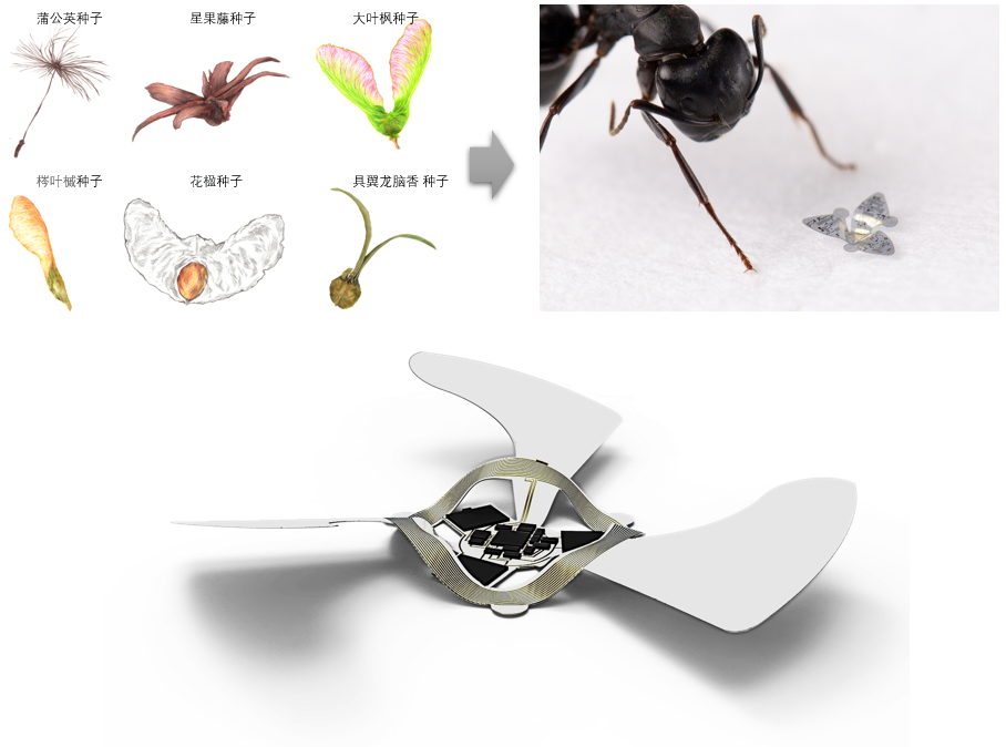 传统微飞行器的设计通常基于主动驱动模块,即模仿昆虫或鸟类等使用扑翼、旋翼等方式使微飞行器实现飞行。然而,这类主动驱动模块结构复杂、难以小型化集成,而且工作时无法避免产生噪音,隐蔽性较差;此外,主动驱动方式能耗极大,难以完成长时间、远距离巡航。研究人员以风传植物种子作为灵感,采用力学引导屈曲自组装的方式设计了微飞行器的三维结构,并在这种微小的结构上成功的集成了复杂的电子电路系统,可依据需要完成诸如空气污染物大范围、长时间实时监测等功能。