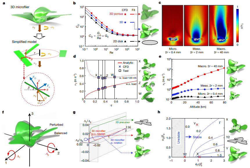 该类飞行器可以实现在空气中以极小的速度下落,从而实现长时间滞空。其下落速度约0.28m/s,约为雪花速度的1/8。仿生植物种子的三维结构可以进一步减缓下落速度,并使其飞行状态更加稳定。该工作主要致力于理解这类飞行器的旋转下落机理,通过数值仿真结合理论模型分析解析了其背后的基本物理原理,建立了下落速度与稳定性设计的物理模型,为将来该类飞行器的设计提供了指导思路。