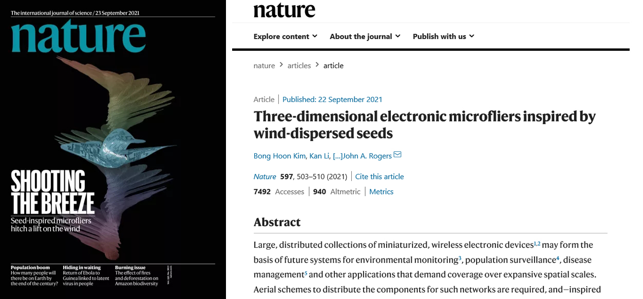 9月22日,数字制造装备与技术国家重点实验室新引进教师厉侃与美国西北大学John A. Rogers、黄永刚课题组等多所科研机构的合作研究成果:仿风传种子三维微电子飞行器——“Three-dimensional electronic microfliers inspired by wind-dispersed seeds”,在期刊《自然》(Nature)在线发表,并当选该期封面。厉侃与韩国崇实大学助理教授金奉勋(Bong Hoon Kim)、美国西北大学博士后金镇泰(Jin-Tae Kim)、朴尹锡(Yoon seok Park)为文章共同第一作者。美国西北大学John Rogers院士、黄永刚院士、清华大学张一慧教授和美国伊利诺伊大学香槟分校Leonardo Chamorro教授为本文共同通讯作者。