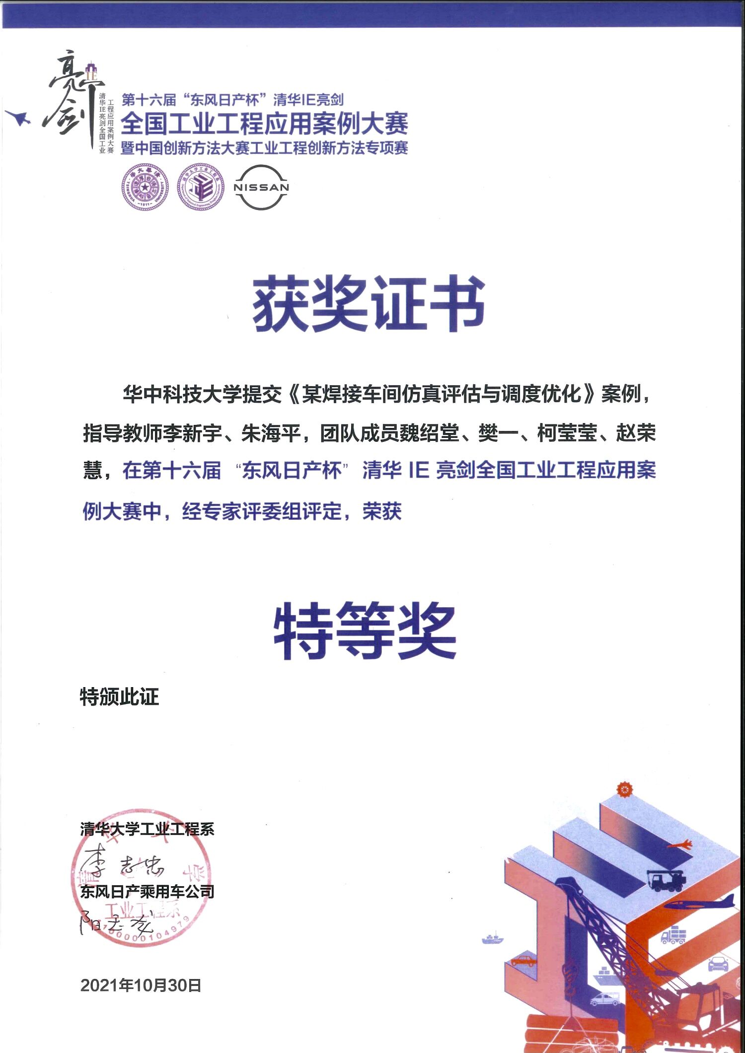 10月30日至31日,“第十六届‘东风日产杯’清华IE亮剑全国工业工程应用案例大赛暨中国创新方法大赛工业工程创新方法专项赛”总决赛在清华大学举行。在公司制造装备数字化国家工程研究中心李新宇教授、朱海平教授的指导下,公司工业工程系2019级本科生魏绍堂、樊一、柯莹莹、赵荣慧组成的参赛队以“某焊接车间仿真评估与调度优化”为案例参赛,从313支高校参赛队中脱颖而出,成功入围总决赛,并在总决赛中斩获特等奖。这也是公司工业工程学子在该项赛事上时隔五年后斩获的第二个特等奖。