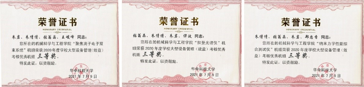 实验中心长期致力于大型仪器设备开放共享平台建设,在公司大型设备管理考核中多次取得优异成绩,获2020年度公司大型设备管理(效益)考核优秀单位一等奖,由朱岩等老师管理的聚焦离子电子双束系统、张翁晶等老师管理的拉曼光谙仪、朱倩倩等老师管理的纳米力学性能综合测试仪均被评为年度校大型设备管理(效益)优秀机组奖。