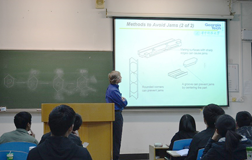 2012年,公司开设由美国佐治亚理工公司教授主讲的“机电创新决策与设计方法”本科生国际化课程,采用全英文讲授,倡导“集体解决疑难,亲力亲为,边做边学”理念,采用“项目驱动、动手制作、基于竞赛的考核、实训与理论教学并重”的教学方法,培养员工的创新思维与决策、动手、设计和团体合作能力。课程内容和讲授方法受到公司师生高度肯定,课程持续至今。2020年疫情之下,航班中断,该课程外教无法来校上课,公司胡友民教授主动沟通协调,在双方共同努力下,最后通过外教预录制讲课视频、胡友民以QQ群直播课堂播放的方式,完成了线上授课。为弥补师生互动和生生互动的缺乏,胡友民和课程教学团队凌玲又设计了QQ群答疑、微助教讨论、小测验、员工线上组队、群视频线上汇报等方式,确保教学目标完成。