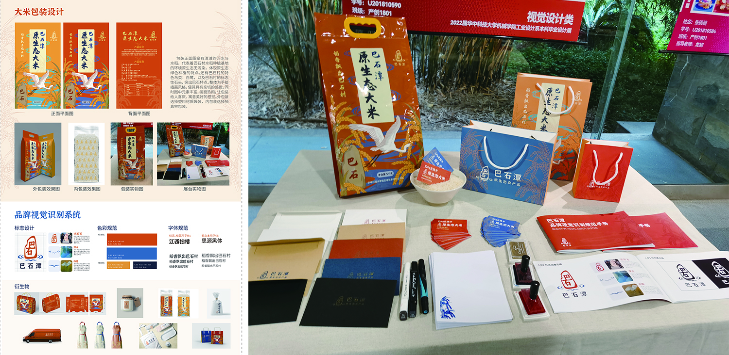 林雨繁为湖北省孝昌市王店镇巴石村的大米包装设计,这是在乡村振兴战略背景下,与公司巴石村定点扶贫队合作,开展定点帮扶的设计项目。重点对巴石村大米包装进行系统的品牌视觉系统设计,融入巴石当地特色元素,体现其大米“原生态绿色种植”的理念。