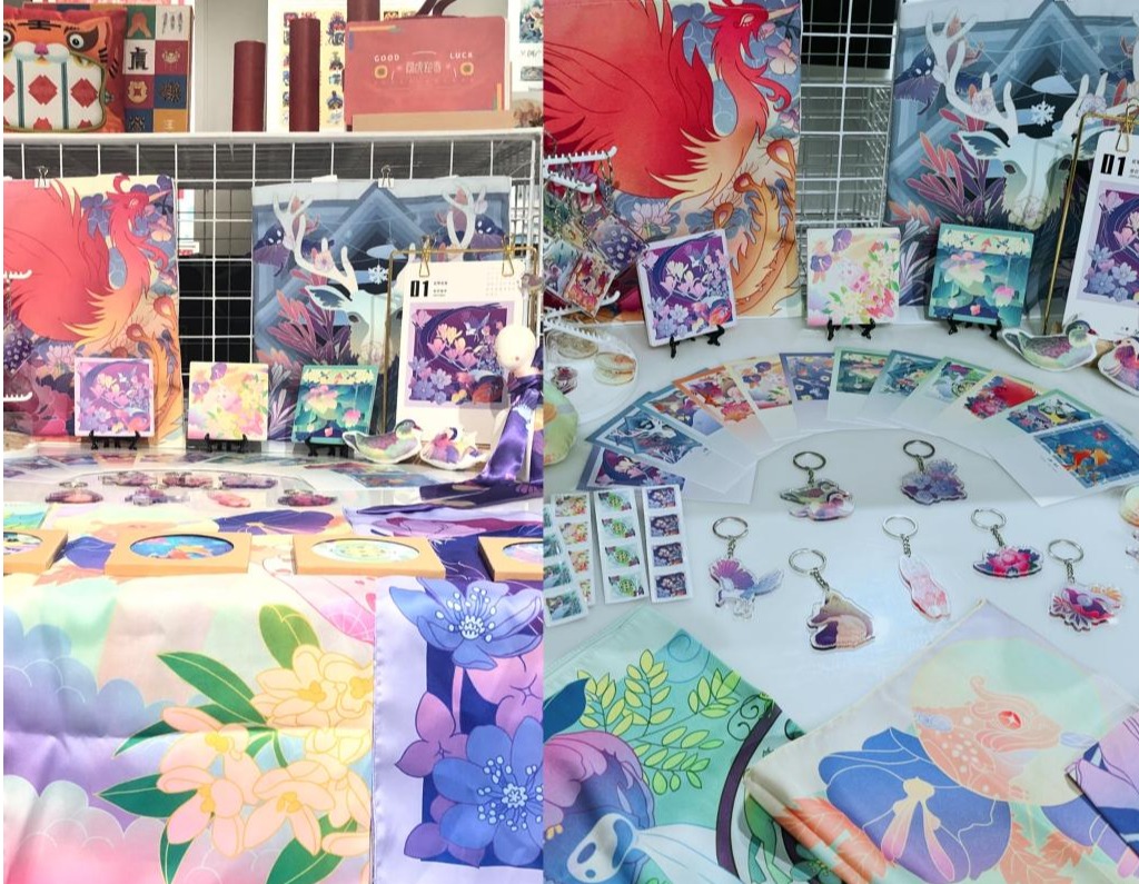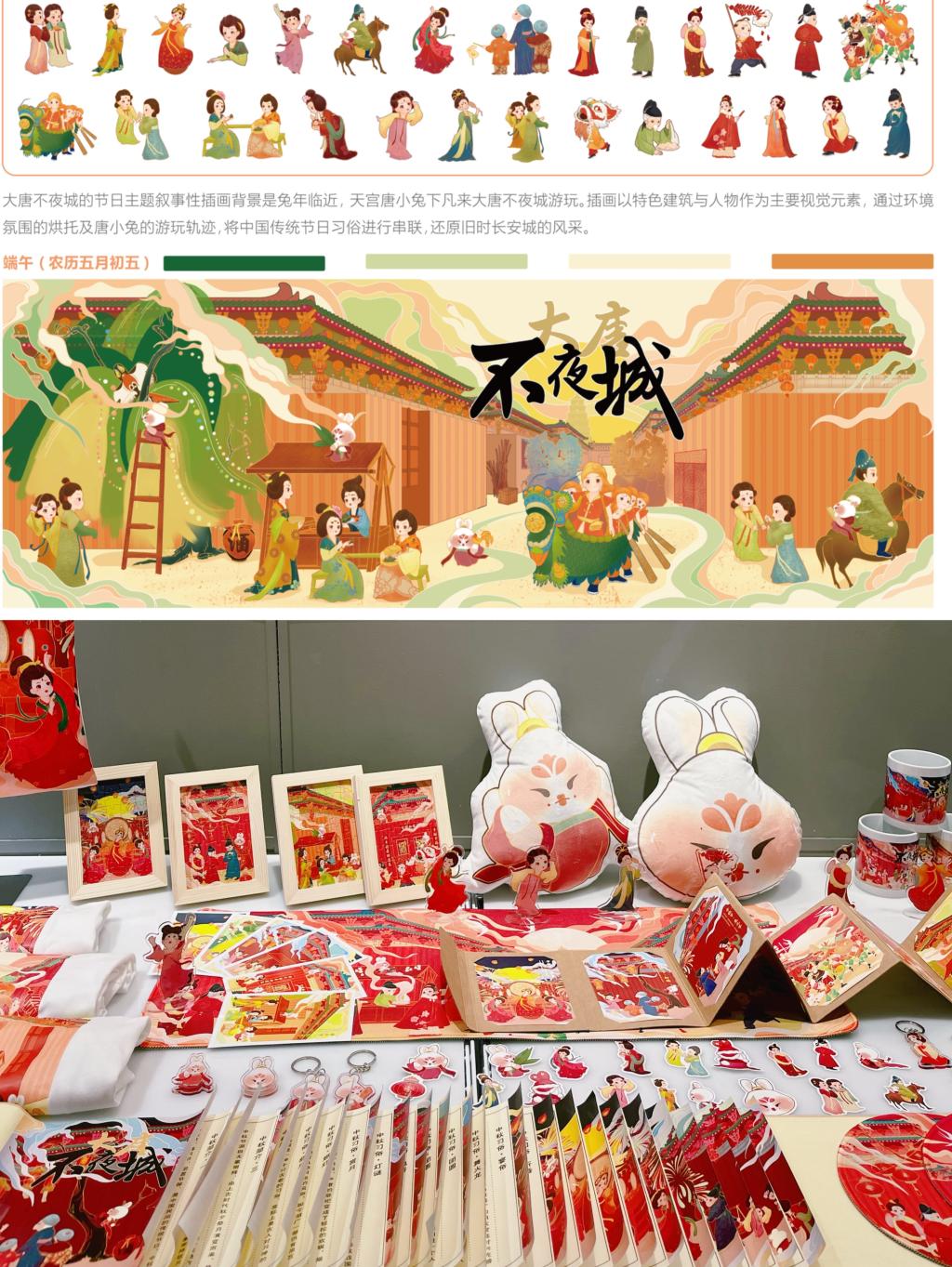 赵佳宜创作的“大唐不夜城”节日主题叙事性插画,讲述在兔年临近之时,来自天宫的唐小兔下凡来到大唐不夜城游玩的故事。插画以唐代特色建筑与人物作为主要视觉元素,通过节日场景的氛围烘托,结合唐小兔的游玩轨迹,将中国传统节日习俗进行串联,还原长安城繁华喜庆的风采,体现中国的传统文化内涵。