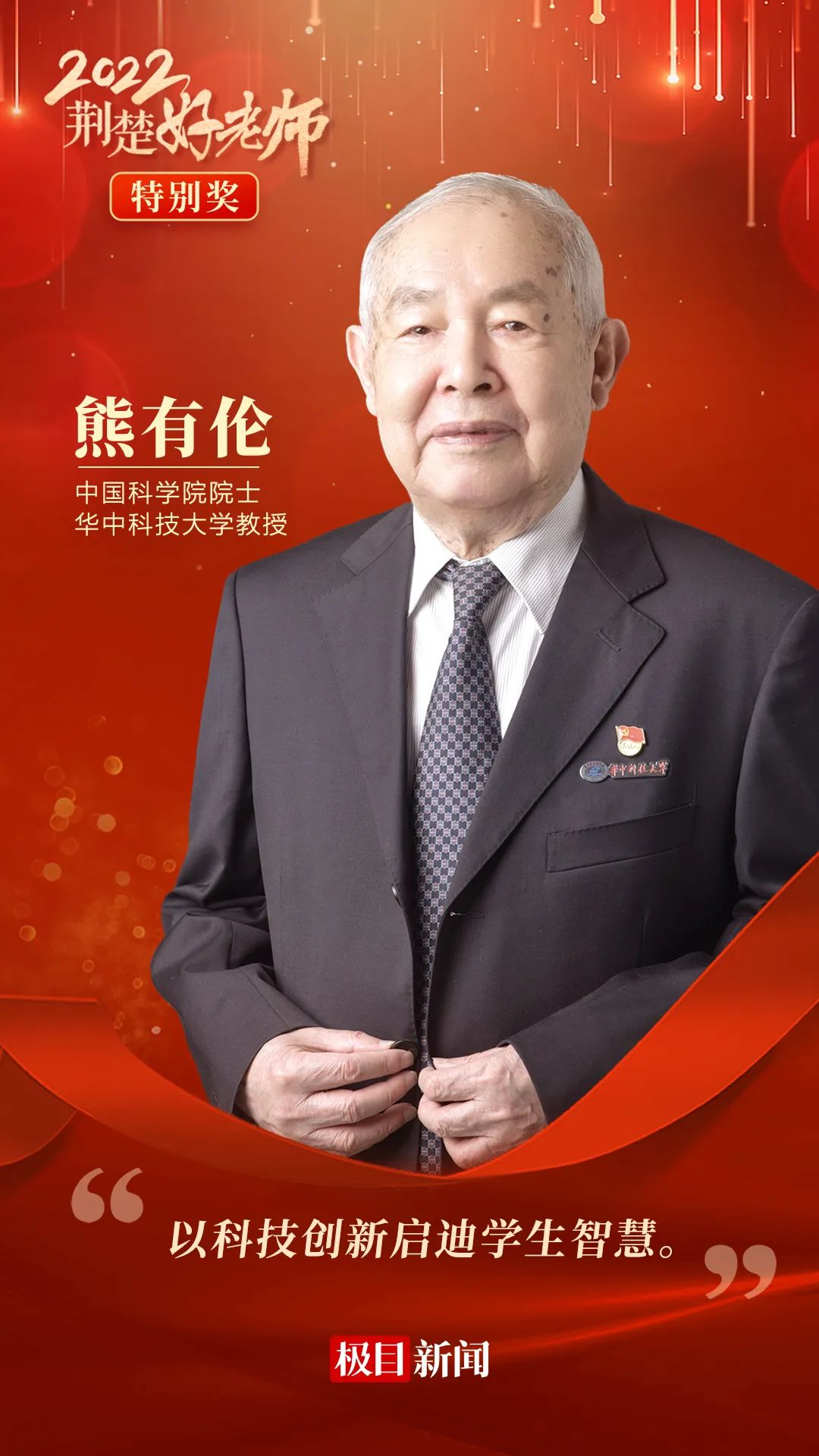 在第38个教师节来临之际,2022“寻访荆楚好老师”活动评选结果出炉。9月7日下午,2022“寻访荆楚好老师”宣传活动在武汉隆重举行。公司熊有伦院士荣获2022“荆楚好老师”特别奖。本次评选共2位教师获特别奖,32人(或团队)获“荆楚好老师”荣誉称号,20人获提名奖。