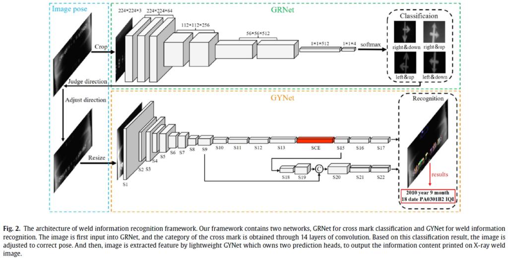 针对上述科学和工程问题,研究团队在研究论文中提出了一整套轻量化和高精度的X射线焊缝图像信息识别框架,该框架基于深度学习领域中的卷积神经网络以及轻量化设计等关键技术,取得了良好的精度和模型实时性。文中分别提出了一种面向方向信息标记的分类网络(GRNet),以及一种面向焊缝信息标记的检测网络(GYNet)。