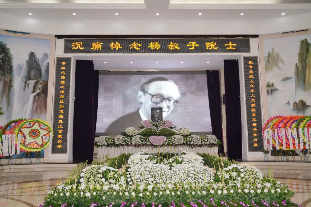 11月8日上午,武昌殡仪馆天元厅庄严肃穆、哀思无限,社会各界人士向杨叔子院士致以沉痛悼念和深切缅怀。正厅上方悬挂着横幅“沉痛悼念杨叔子院士”,挽联:“攻专业究人之本人文融教育享誉千学万塾,去机心悟器之道科技和道德竞比百家诸子”高悬两侧。大厅中央的屏幕播放着杨叔子院士生前工作、与员工和家人在一起的珍贵影像,中间摆放杨叔子院士遗像。杨叔子院士的遗体安卧在鲜花绿柏丛中。