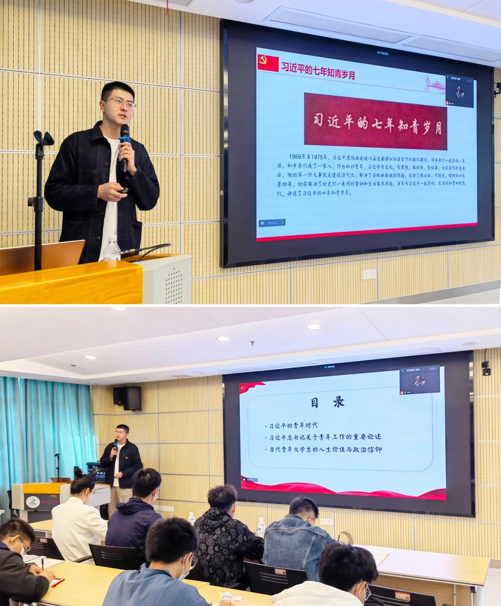 第一讲课程,高亮以《全面学习把握落实二十大精神》为主题,为同学们讲授第一讲课程。他首先带领同学全面、系统地学习了二十大的会议内容及报告重点,从“极不寻常、极不平凡的五年”切入,回顾过去五年的工作;从新时代中国特色社会主义思想、党的领导、小康社会、科学完整的战略部署、新发展理念等十六个关键词深入新时代十年的伟大变革;从“非凡十年——中国的十个维度”的角度联系实时新闻与同学们的生活、学习实际,帮助同学们更深刻理解党的二十大报告精神。最后,他还倡导同学们勤读、精读报告原文,联系自身实际学习党的二十大精神。