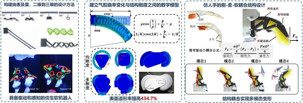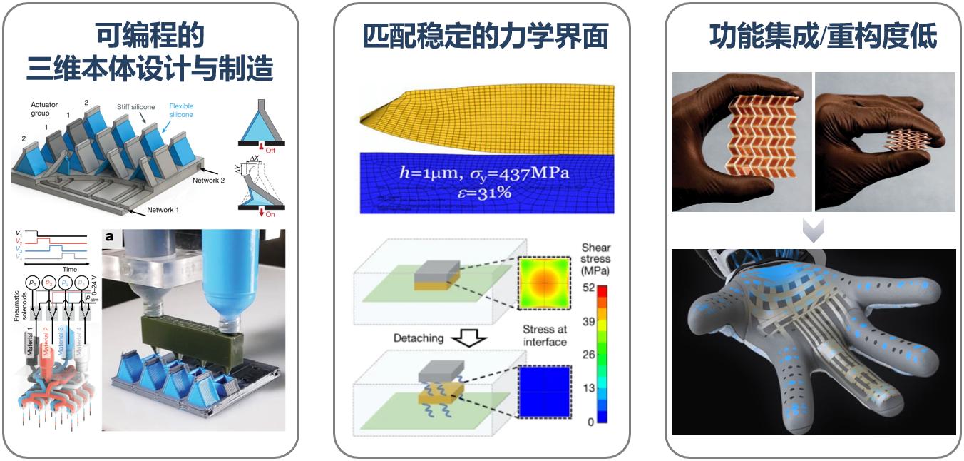 软体机器人具有高自由度的类生物响应行为,已经逐渐成为人-机-环境共融生态中的重要载体形式。凭借着柔顺大变形、友好交互等特性,软体机器人在医疗、制造、勘探、人机交互等领域具有很强的应用潜力。但是软材料独有的大变形特性,完全颠覆了原来以硬质材料和小变形为主的设计方法和加工体系。因此在当前软机器人的设计与制造方面存在可编程设计机理尚不明确、大变形条件下异质梯度刚度层界面易失效、有限本体空间内功能集成度和重构性低的缺点(图1)。