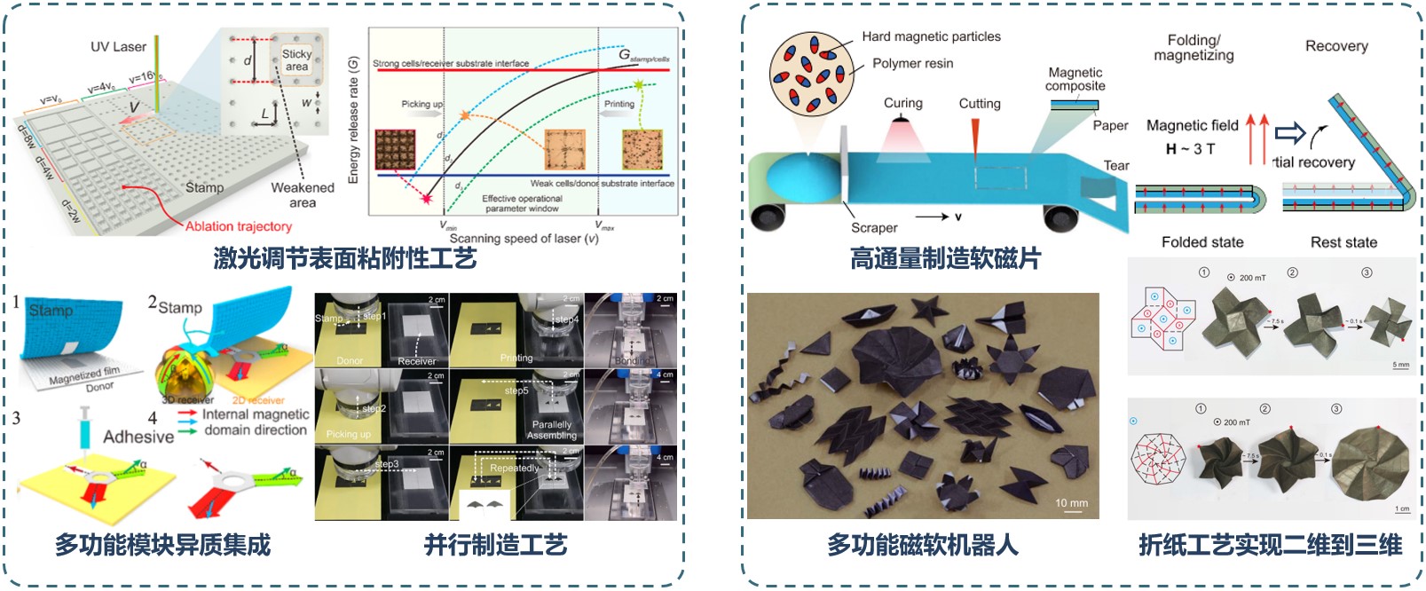 在软体机器人的结构与功能制造工艺层面:1)研发了激光调节表面黏附性的工艺,并实现了并行大通量、三维异质集成制造工艺;2)开发基于卷对卷加工的高通量软磁片制造工艺,实现折纸多功能机器人的批量制造(图3)。并基于这些工艺,开发了手指康复软体机器人、叶片表面裂纹检测的机器人和相关制造装备。