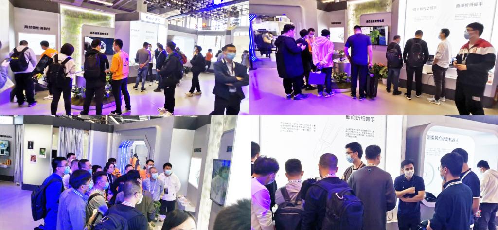 根据展方需求与展会要求,团队集结了10余位研究生、博士后参与布展,与大会展台负责人沟通展示方案、布置调试现场展品等工作,以确保展品工作稳定性与展示度。在大会开展的三天期间,团队成员们细致安排、分工协作,不仅向前来参展的各界人士耐心介绍团队在软体机器人领域的最新研究成果,还通过生动有趣的现场互动环节,宣传了近场传感的植物电子发光器件、完美抓取香灰的多功能抓手等先进研究成果,激发了观众们对科研探索的兴趣与热情。