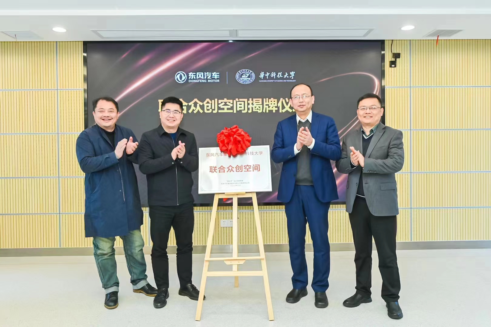 活动现场,汪波、刘丰华和段政、曹淮为“联合众创空间”共同揭牌。该平台旨在通过校企合作形式,协同开展汽车相关课题研究,并对东风“梦想车大赛”项目给予全面的支持。