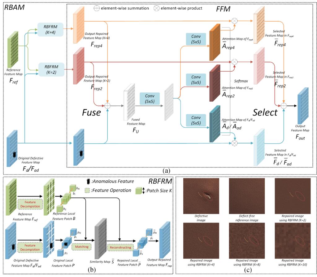工业场景中正常样本的数量远远大于缺陷样本的数量,无监督和弱监督方法是缺陷检测领域的研究热点。本文提出基于“参考注意力机制”和“缺陷特征感知”的检测方法NDP-Net。如图1所示,该方法使用编码器来获得多尺度的纹理语义特征,通过人工缺陷样本和正常样本进行对比学习使得编码器具备像素级的判别能力,并在潜在空间和跳跃连接处构建基于参考的注意力模块(RBAM),如图2所示,RBAM利用参考的正常特征来修复异常特征,并在多个尺度上进行特征融合,重构出无缺陷的图像;为了提高缺陷分割的精度,该网络没有像常规方法那样直接将输入和重构做差,而是利用多尺度分割模块对输入和重构的串联特征进行感知,从而获得有语义信息的异常分割图。论文在公开数据集上取得SOTA检测精度,并应用于实际工业场景。