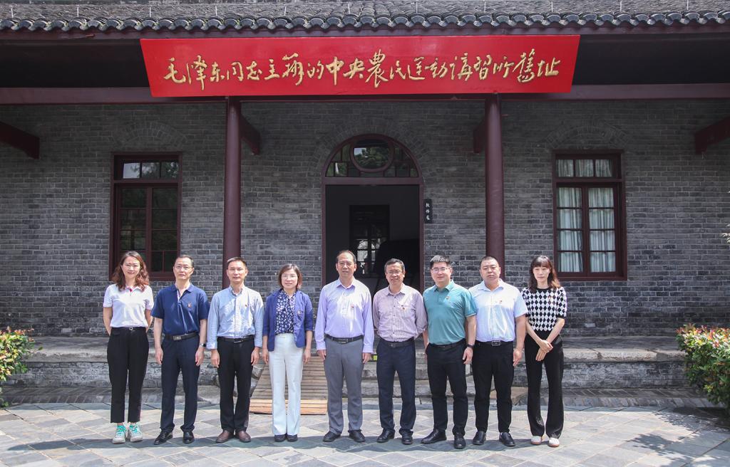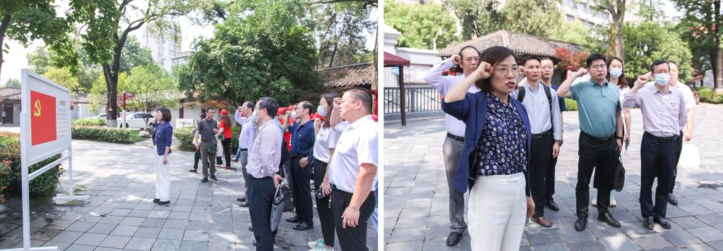 副经理张芬在武昌中央农民运动讲习所外带领党员重温入党誓词。农讲所1958年复原建成,大门上的“毛泽东同志主办的中央农民运动讲习所旧址”匾额,由周恩来总理亲笔题写。中央农民运动讲习所可以说是农民革命大本营,同时设置了军事课程,指导学员参加实际革命武装斗争,为革命培养了大批优秀干部。