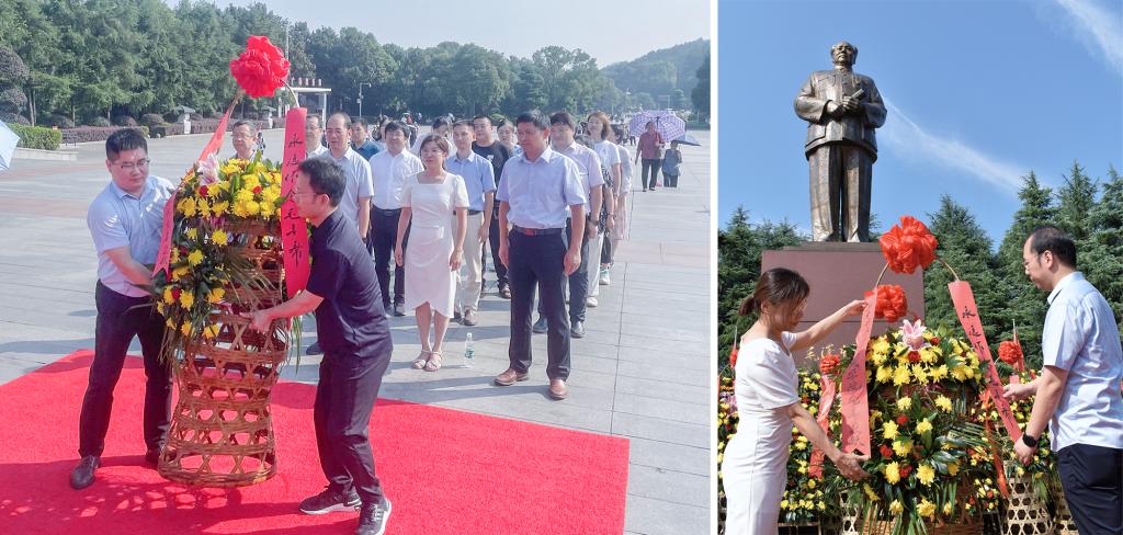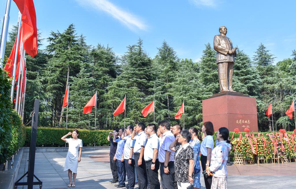 在毛主席铜像广场,全体人员整齐列队,向毛主席铜像敬献花篮,鞠躬致敬,表达深切的敬仰与缅怀之情。张芬带领全体党员面向党旗,举起右拳,一字一句重温入党誓词。大家用铿锵有力的声音进一步坚定理想信念,牢记共产党人的初心和使命。