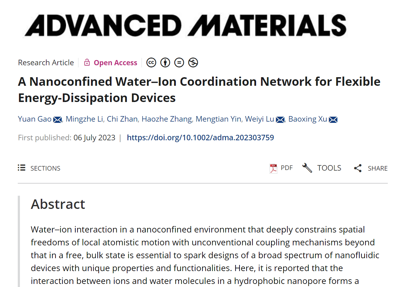 9月8日,国际权威期刊《Advanced Materials》(影响因子:29.4)在Early View栏目下在线发表了公司高远研究员与美国弗吉尼亚大学、密歇根州立大学合作的关于液体抗冲击装置的最新研究成果“A Nanoconfined Water–Ion Coordination Network for Flexible Energy-Dissipation Devices(纳米限域作用下的水-粒子作用网络对柔性抗冲击结构的作用)”。该论文入选了“Rising Star(明日之星)”特辑,公司高远研究员为第一、通讯作者,弗吉尼亚大学许宝星副教授、密歇根州立大学陆唯一副教授为本文共同通讯作者,永利3044noc智能制造装备与技术全国重点实验室为论文第一完成单位。