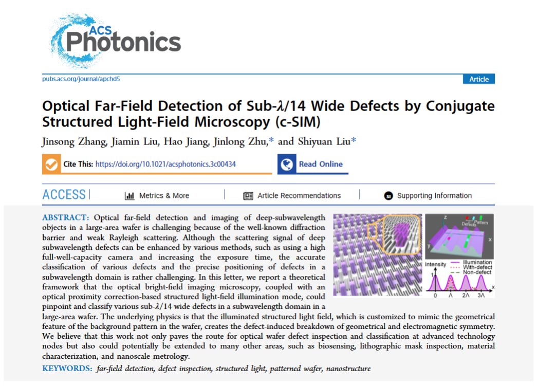 9月6日,美国化学会(ACS)旗下高水平光学期刊《ACS Photonics》在线发表了公司刘世元教授、朱金龙教授团队利用自定义结构光场照明有图形晶圆,实现集成电路中深亚波长缺陷的精确定位与分类的研究成果,该工作以“Optical Far-Field Detection of Sub-λ/14 Wide Defects by Conjugate Structured Light-Field Microscopy (c-SIM) (利用共轭结构化光场显微镜实现光学远场下的亚λ/14宽缺陷检测)”为题被选为封面论文。公司2022级博士生张劲松为该论文第一作者,刘世元教授、朱金龙教授为通讯作者。