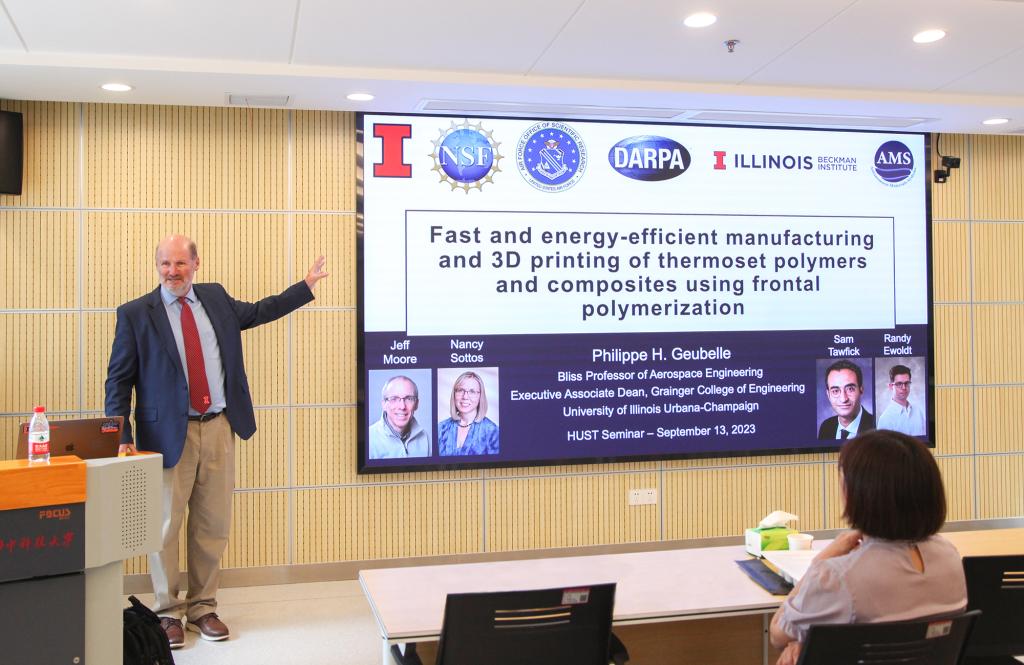 Geubelle教授担任伊利诺伊大学香槟分校格兰杰工程公司的常务副经理、航空工程系阿贝尔布里斯教授,并兼任机械科学与工程系、贝克曼先进科技研究院、国家超级计算中心教授。他以“Fast and energy-efficient manufacturing and 3D printing of thermoset polymers and composites using frontal polymerization(利用前端聚合进行高效、节能的高分子复合材料制造与3D打印)”为题,详细陈述了高分子材料广泛的应用及其制造领域面临的重大挑战,生动形象地介绍了前端聚合技术的原理和优势,系统地讲述了其研究团队如何围绕该技术展开理论与应用并重的研究工作,并实现多样化的制造过程。