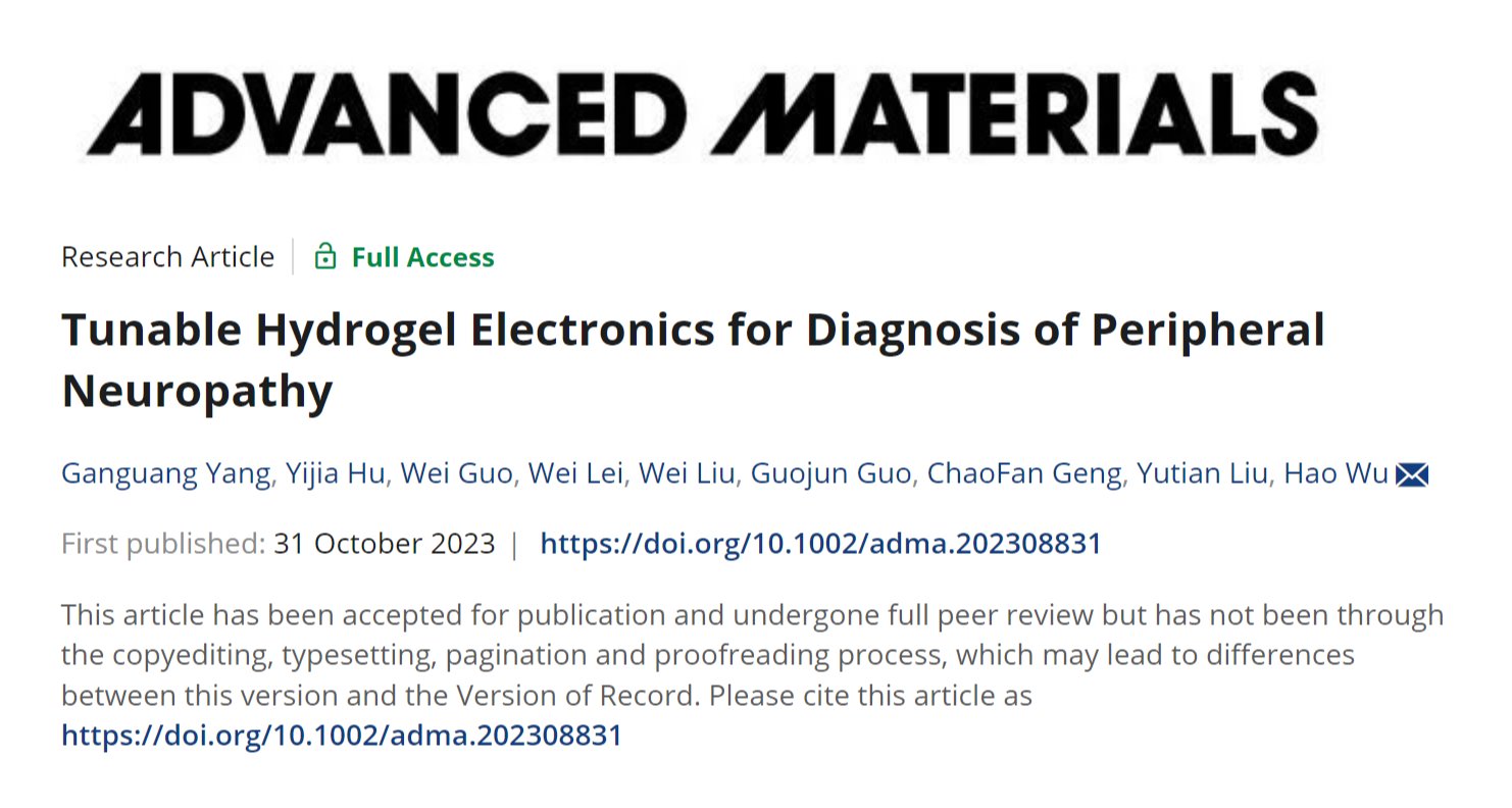 10月31日,国际权威期刊《Advanced Materials》上刊发公司吴豪研究员团队在柔性电子医工交叉领域的新成果,题为“Tunable Hydrogel Electronics for Diagnosis of Peripheral Neuropathy(可调水凝胶生物电子用于诊断周围神经病变)”,公司博士生杨淦光为论文第一作者,吴豪研究员为通讯作者,附属协和医院刘玉田医生为共同通讯作者。