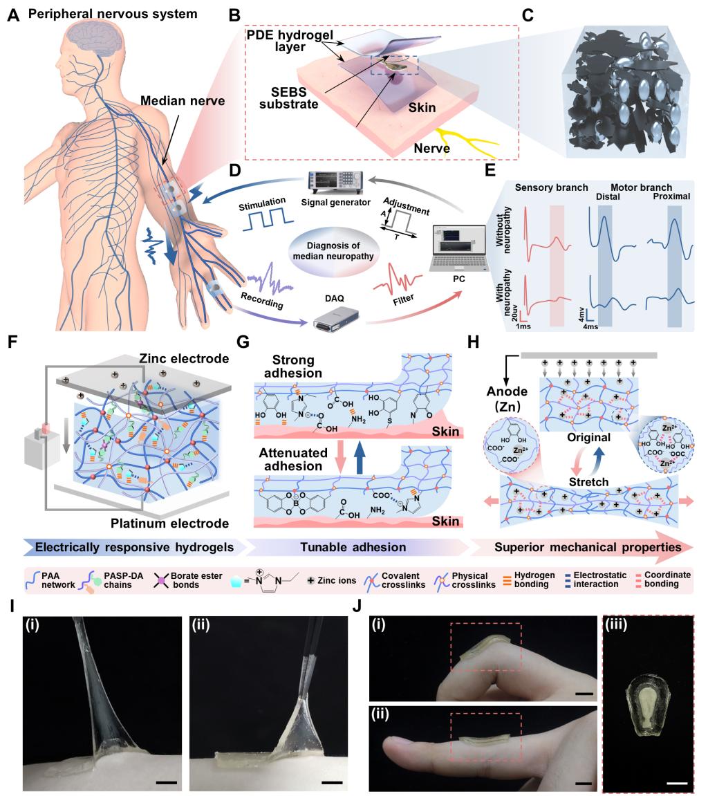 周围神经病变作为最常见的神经系统疾病之一,由于致病因素多样,患者数量呈持续增长趋势。因此,急需有效的早期诊断与及时干预来延缓病情的发展。目前,采集分析肌电图信号的幅值、传导速度和潜伏期被认为是评估神经损伤程度的有效方法。诊断过程中,由金属刺激电极施加脉冲电压引起的神经动作电位,并通过神经传导,最终由商用凝胶电极采集肌电图信号。然而由于受损神经的多样性(如:运动/感觉/混合神经),信号幅度范围从微伏到毫伏不等,且检测位置多样性(如:手指/脚踝/手腕),商用电极存在模量大,黏性低,可拉伸性差等缺陷,难以与皮肤共形贴附,极大地削弱了其刺激和采集性能,信号质量严重下降。此外,不同患者皮肤敏感性存在差异(如:多毛皮肤、幼儿皮肤和老年人松弛皮肤),商用凝胶电极通常表现出不可调节的粘附性,剥离过程中可能导致患者不适。因此,如何实现电极粘性可调,柔性可拉伸性优化以及进一步提高电极的刺激采集性能,采集高保真度肌电图信号,最终确保高精度周围神经病变诊断和良性剥离成为研究关键。