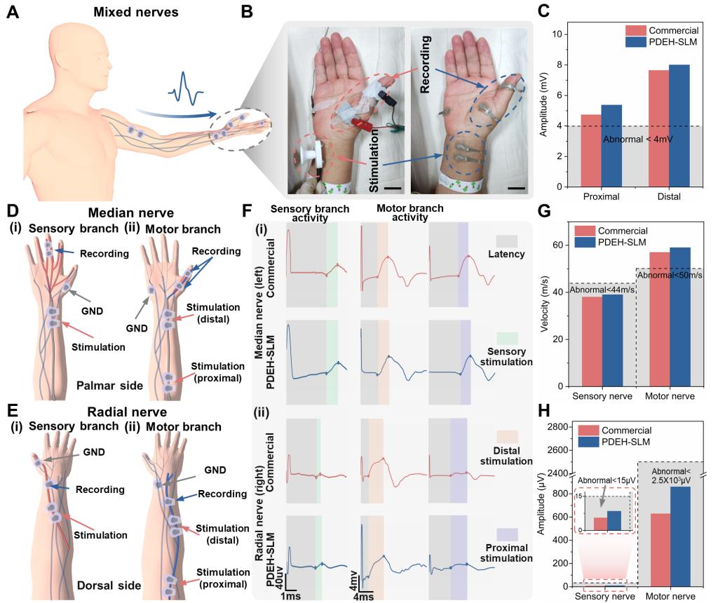 研究人员进一步在临床病例中采用水凝胶贴片采集感觉神经、运动神经和混合神经的肌电信号。通过分析肌电信号的幅值、传导速度和潜伏期,验证PDEH-SLM贴片诊断腓肠神经(感觉神经)、腓总神经(运动神经)、正中神经(混合神经)和桡神经(混合神经)等神经损伤的有效性。对于皮肤曲率大(手指)或皮肤松弛(老年人)的临床病例,由于其出色的柔性和粘性,水凝胶贴片可以实现紧密贴附。进一步电场诱导水凝胶贴片黏性削减,实现多毛皮肤和儿童娇嫩的皮肤上良性剥离。在具有不同黏性需求的临床病例中,通过比较水凝胶器件和商用电极采集的肌电图,得出了一致的神经损伤诊断结论,验证了水凝胶贴片在周围神经病变诊断中的有效性。