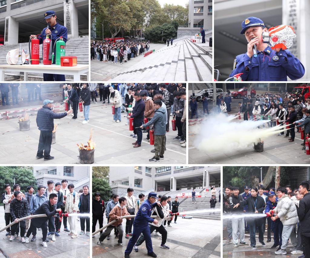 随后,在灭火器材实操环节,保卫处几位老师们为大家介绍了灭火器的类型和使用方法,讲解如何各类灭火器和消防栓水带。师生积极参与,分组进行实操,使用灭火器、水龙带扑灭了被点燃的演练火源。