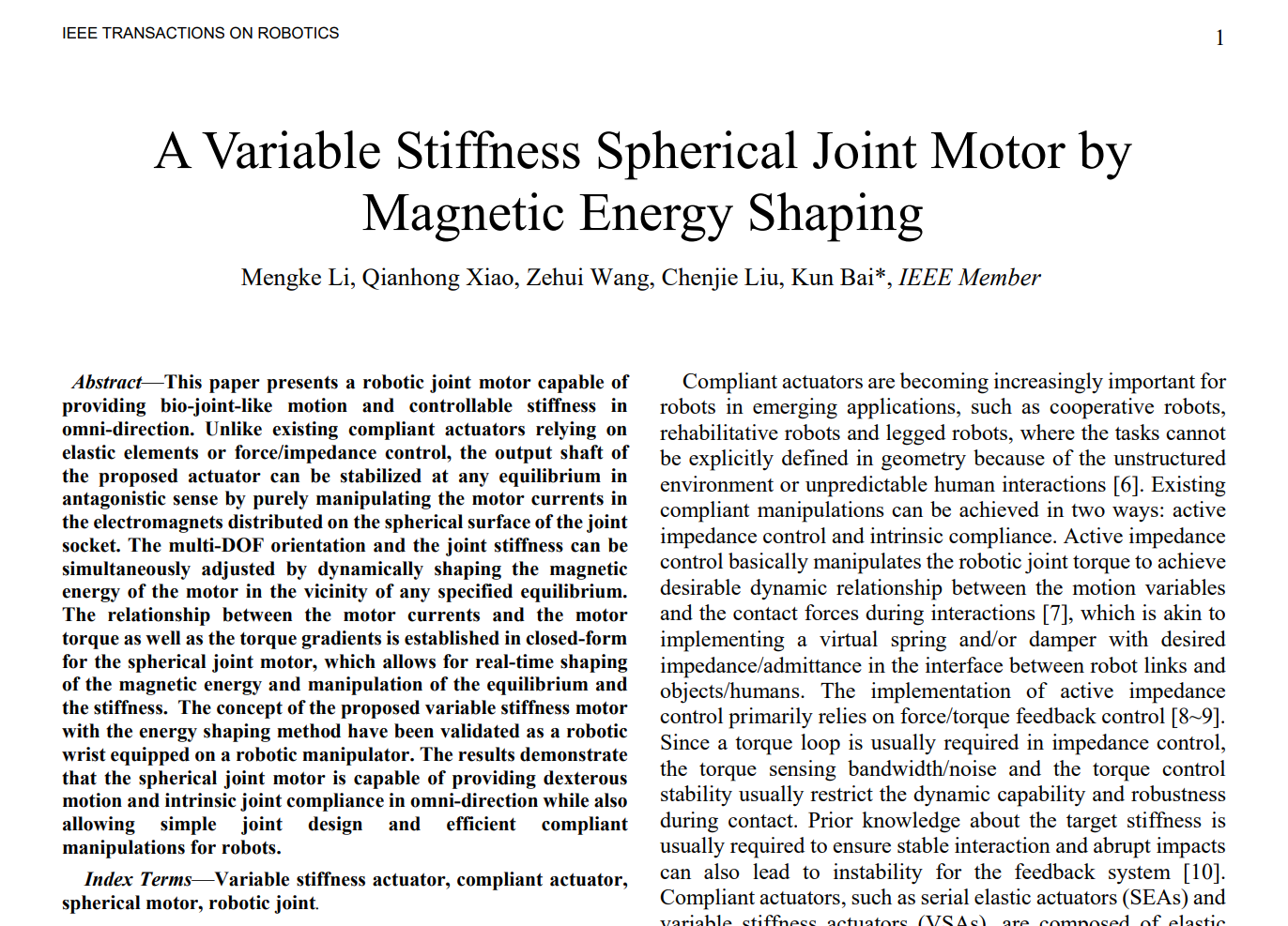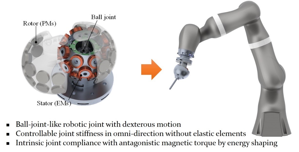 12月1日,机器人领域顶级期刊IEEE Transactions on Robotics在线刊登了公司智能制造装备与技术全国重点实验室白坤教授团队在机器人万向变刚度驱动最新研究成果“A Variable Stiffness Spherical Joint Motor by Magnetic Energy Shaping(磁能场整形可变刚度球关节电机)”(DOI: 10.1109/TRO.2023.3336319)。 公司智能制造装备与技术全国重点实验室为论文第一完成单位,公司硕士研究生李孟轲为第一作者,白坤教授为论文通讯作者,公司博士生肖千红、刘陈杰及硕士生王泽辉参与了该研究。该项工作得到国家自然科学基金基础科学中心项目“机器人化智能制造”(No. 52188102)以及湖北省科技人才创新计划(No. 2023DJC141)资助。