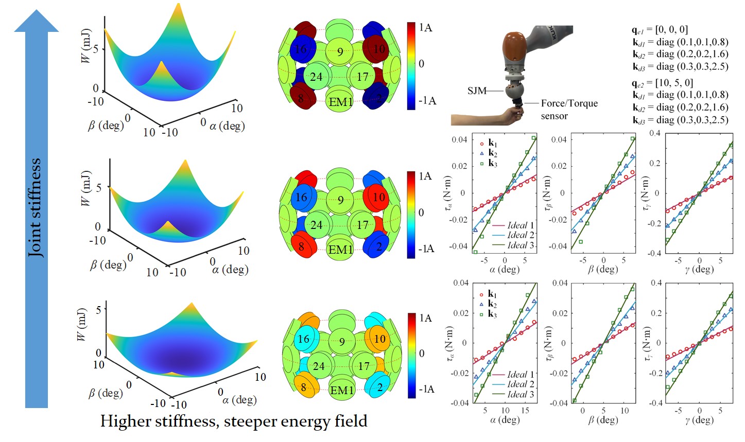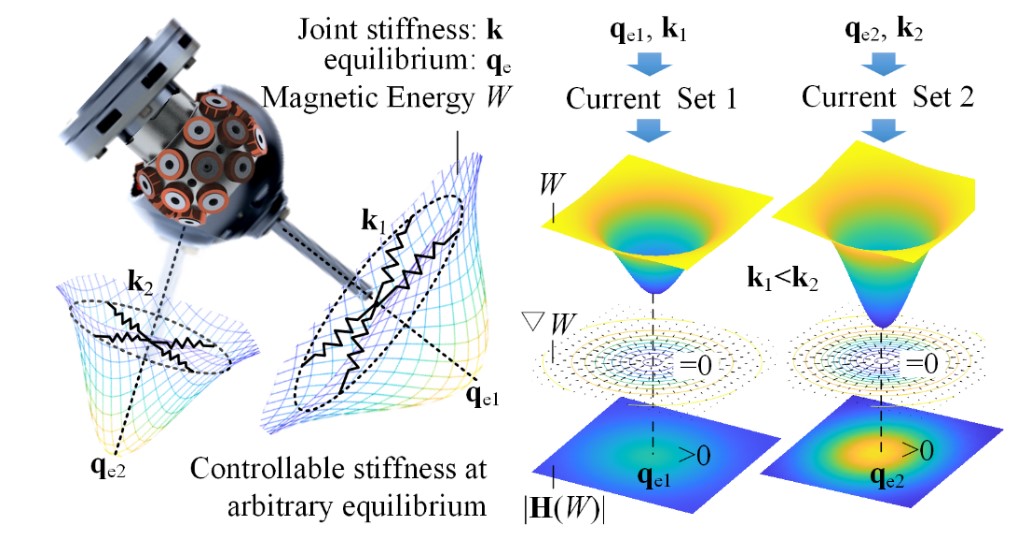 为了使机器人能够在非结构化环节中更加安全高效地实现人-机-环境的共融,关节的顺应性是新型智能机器人的主要发展趋势之一。现有顺性方法主要通过力的测量控制或者基于弹性元件的变刚度驱动来实现。前者难以克服在未知环境交互中的不稳定问题,后者虽能通过固有的弹性实现高效稳定顺应,但弹性元件需要异常复杂的变刚度机构限制了机器人(尤其是多自由度关节)的灵巧设计。针对这一问题,研究团队提出一种通过控制机器人关节电机磁场进行万向刚度调节的方法。通过控制电机电流形成在任意位置的“凹陷”磁能场,电机转子将处于凹陷位置的平衡点且关节刚度可通过磁能场的梯度调节。该方法不需要位置或力的测量控制,且在不需要任何弹性元件的条件下实现机器人关节各方向固有刚度与三维旋转姿态的动态实时调节。