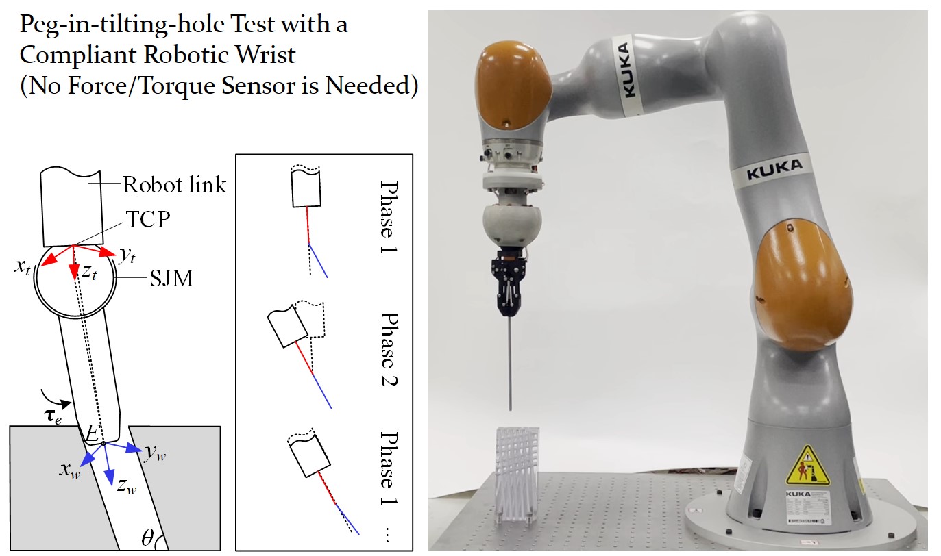 配备有该灵巧手腕的机器人凭借其柔性操作能力进行了大倾角轴孔装配的演示。与传统方法依赖力矩传感器执行轴孔操作方法不同,具有弹性变刚度手腕关节的机器人能够通过灵活配置手腕刚度高效完成任务,整个过程无需力传感器,并且可以适用于具有大范围倾斜角度的轴孔装配(超过30度),无需示教或基于先验知识的编程。