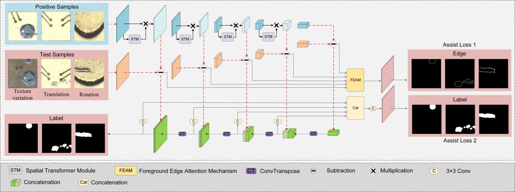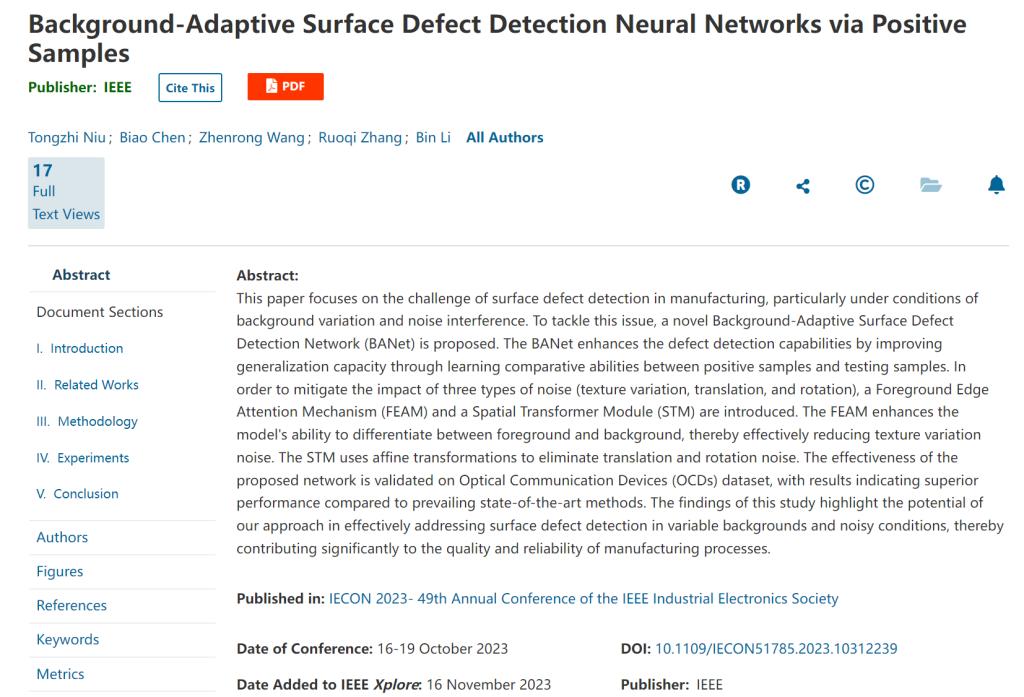同年11月,陈彪还以共同第一作者身份在第49届IEEE工业电子学会年会(IECON 2023)上发表论文,题为“Background-Adaptive Surface Defect Detection Neural Networks via Positive Samples(基于正样本的背景自适应表面缺陷检测神经网络,BANet)”。BANet利用孪生网络同时提取正样本和负样本的特征,再将二者相同特征对齐并做差,解决了背景纹理变化、平移和旋转噪声的问题。该方法在光通讯器件缺陷数据集上取得最佳分割性能。