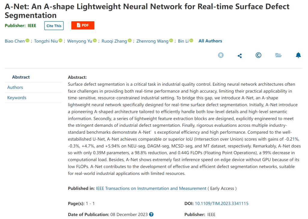 12月8日,国际仪器与测量协会著名期刊《IEEE Transactions on Instrumentation and Measurement,IEEE TIM》(影响因子:5.6)在线刊发了公司国家数控系统工程技术研究中心副教授余文勇课题组在工业表面缺陷智能检测领域的新成果,题为“A-Net: An A-shape Lightweight Neural Network for Real-time Surface Defect Segmentation(A-Net: 一种用于实时表面缺陷分割的A形轻量化神经网络)”。公司2020级本科生陈彪为第一作者,2018级博士生牛通之为共同一作。余文勇副教授为通讯作者,李斌教授为学业导师。