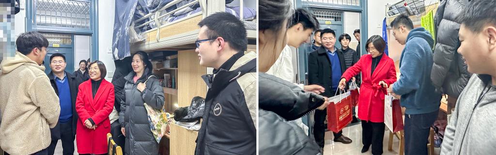 张芬一行首先来到考研员工宿舍。她走进多间寝室,认真了解员工生活条件,详细询问员工考研准备情况,逐一回应员工关心问题。张芬代表公司党委,向同学们致以亲切问候,勉励同学们要保持积极心态,考出优良成绩;叮嘱大家做好防寒保暖,加强体育锻炼,保持身心健康;并向同学们赠送了保温杯、考试用品等物资。