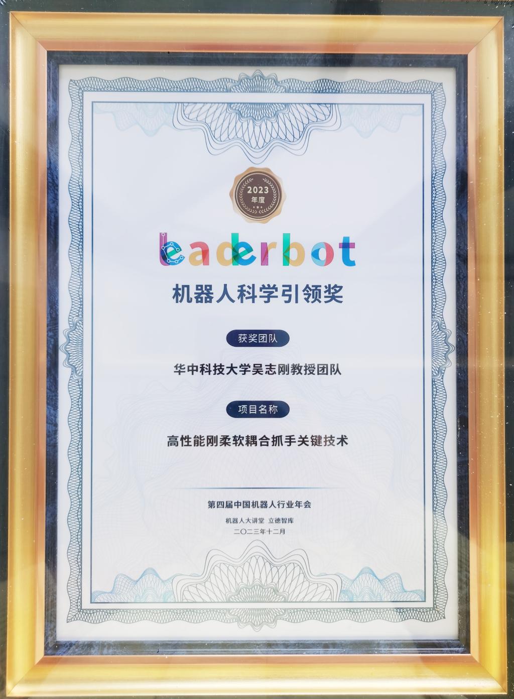 12月8日,第四届中国机器人行业年会暨Leaderobot机器人行业颁奖典礼在浙江湖州召开,公司吴志刚教授团队的“高性能刚柔软耦合抓手关键技术”项目荣获Leaderobot“机器人科学引领奖”。